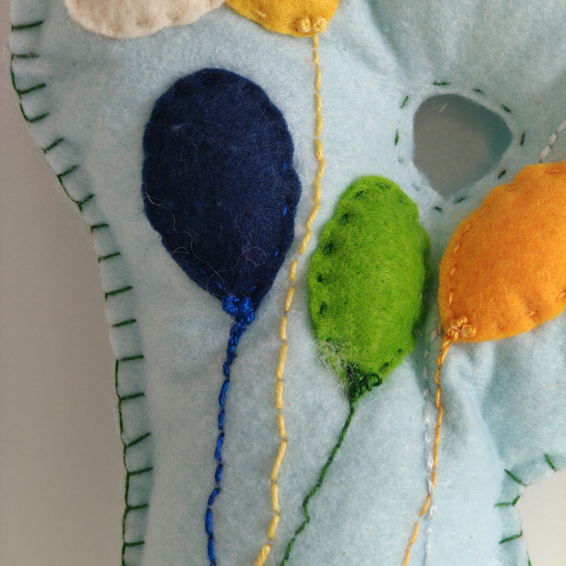 La lettera P è arricchita da applicazioni in feltro che raffigurano palloncini multicolore ricamati a mano, accompagnati da soffici nuvolette panna.