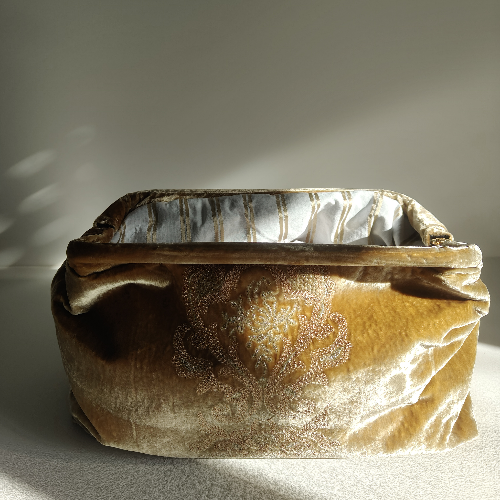 La struttura è realizzata in velluto oro, morbida al tatto e un leggero ricamo in tinta che cattura la luce ad ogni movimento.