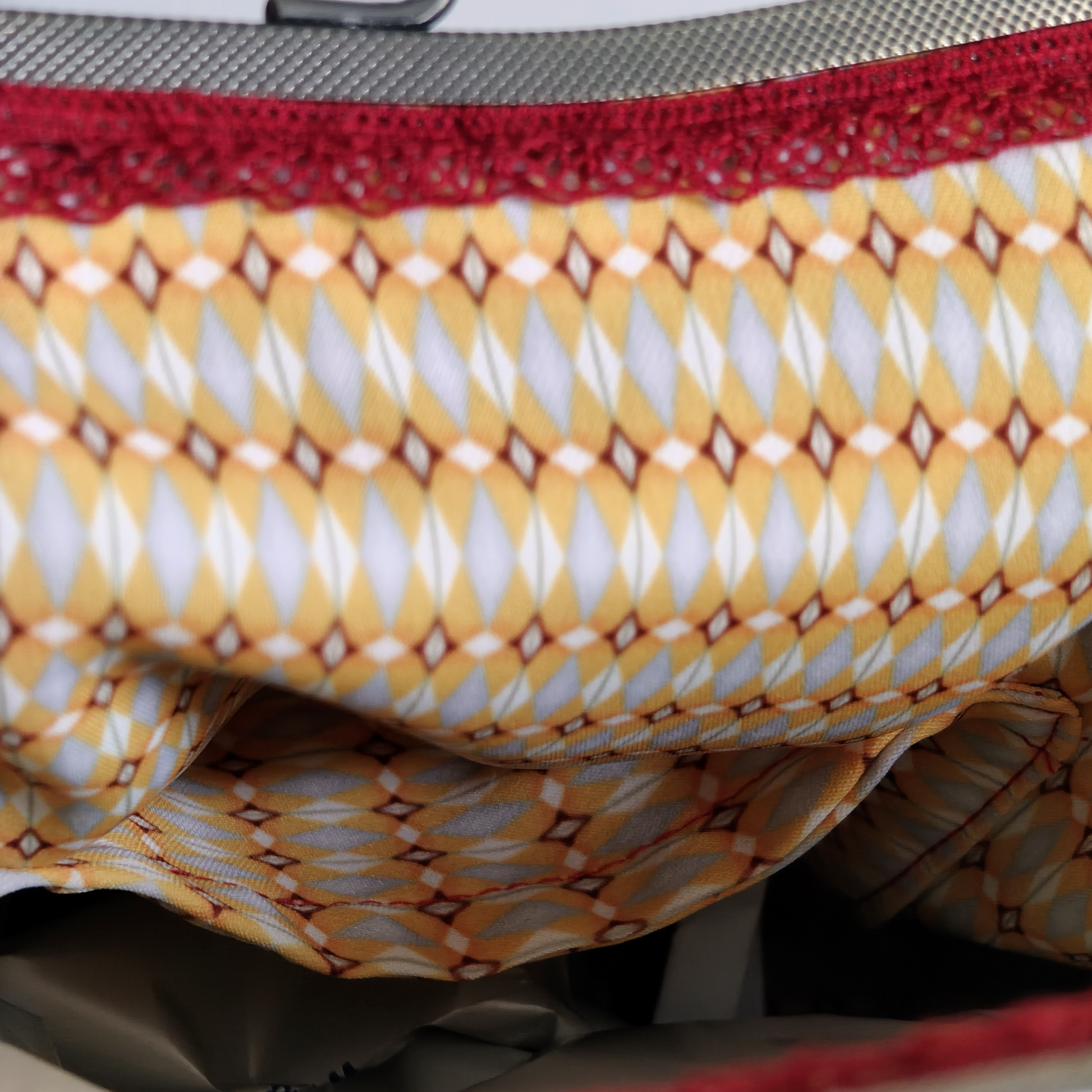 L’interno è rifinito con un tessuto a fantasia geometrica nei toni del giallo, bianco e bordeaux, che crea un piacevole contrasto cromatico e aggiunge personalità al design.